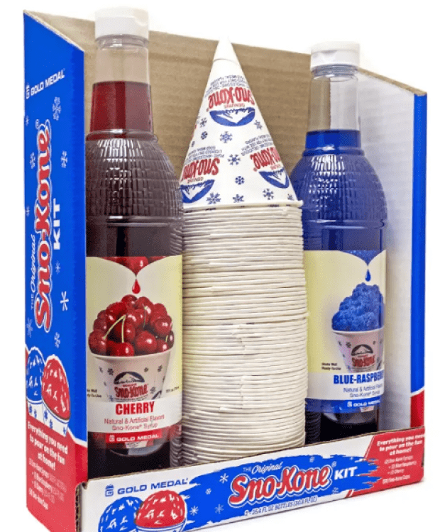 Sno-Cone KitSno-Cone 2:Sno-Cone Kit1Dropdown03144117_31441150000 t's everything you need to pour on the fun and savor the icy treats! Each kit contains 1 Cherry Sno-Kone Syrup (25.4 fl oz), 1 Blue Raspberry Sno-Kone Syrup (25.4 fl oz), and 50 Sno-Kone Cups. Each case contains six kits. The Sno-Kone Kit is great for Sno-Kones , sodas, ice cream topping, cocktails, slush, coffee, and more! To use, just shave ice to desired consistency, scoop ice into the cup, then pour syrup over the top of the shaved ice, and enjoy! Ideal for party rentals, grocery stores, concession stands, and more.
